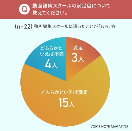 動画編集のスクールに通ったことがある人へのアンケート結果では、80%以上の方が「満足している」「どちらかといえば満足」と回答がありました。