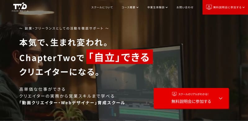 もし、稼ぐために必要な実践的な動画編集スクールを探すなら、Chapter Two(チャプターツー)をおすすめします。