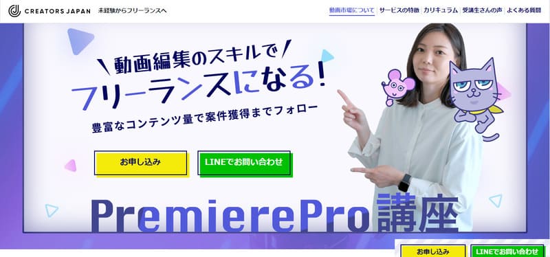 クリエイターズジャパンは、Adobe Premiere Proを中心に、最短14日間で動画編集テクニックを学べるオンライン講座です。