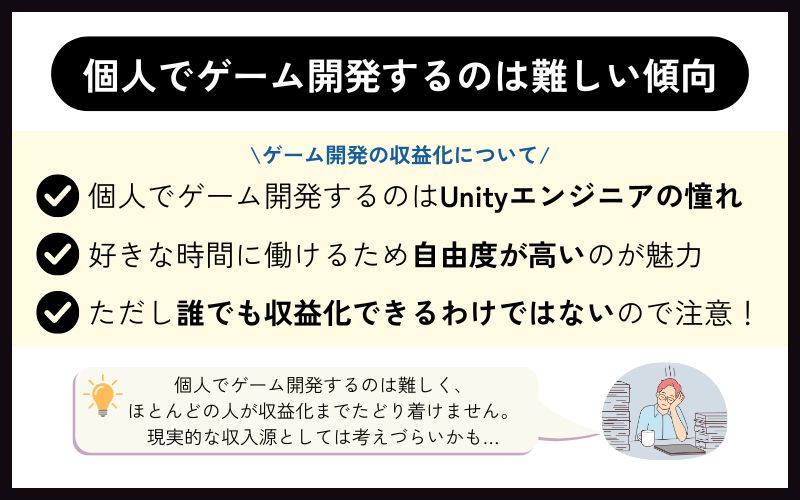 個人でゲーム開発をするのは、Unityの副業として多くの方が関心を寄せている稼ぎ方です。