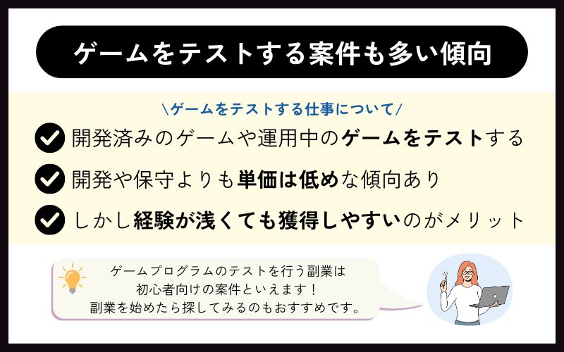 開発案件や運用保守案件が獲得できない方は、ゲームプログラムのテスト案件もチェックしてみましょう。