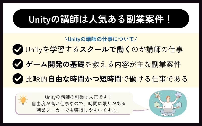 Unityを学習するスクールではゲーム開発の基礎を教える案件が多く、比較的自由な時間に働けます。