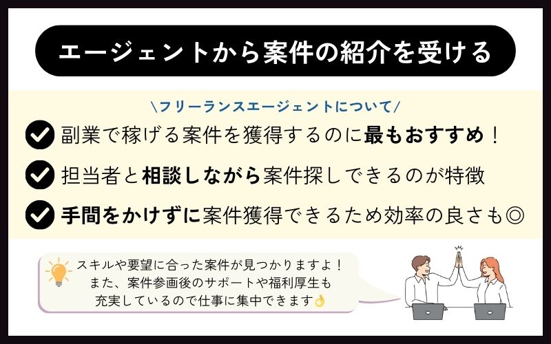 現在多くの副業案件・フリーランス案件が業務委託契約での受注になっているので、もっとも一般的な副業の受注方法です。