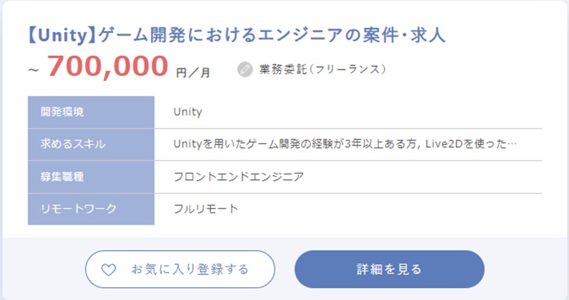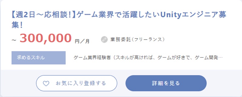 直接Unityを使える案件ではありませんが、獲得しやすいので駆け出しのUnityエンジニアにおすすめです。