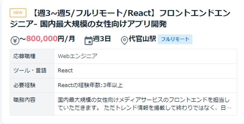 上流工程の案件を獲得するには、Reactを用いた豊富な開発経験が必要なので、3年以上の経験を積んでからチャレンジしてみるといいでしょう。