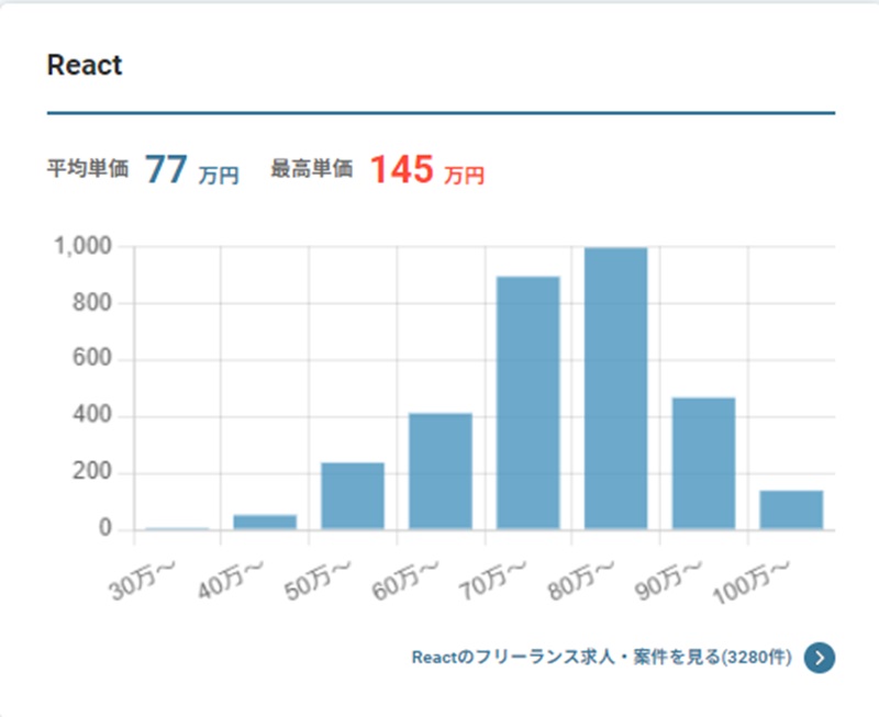 全体の平均単価は77万円となっているので、フリーランスReactエンジニアの場合、80万円前後が収入の目安となるでしょう。