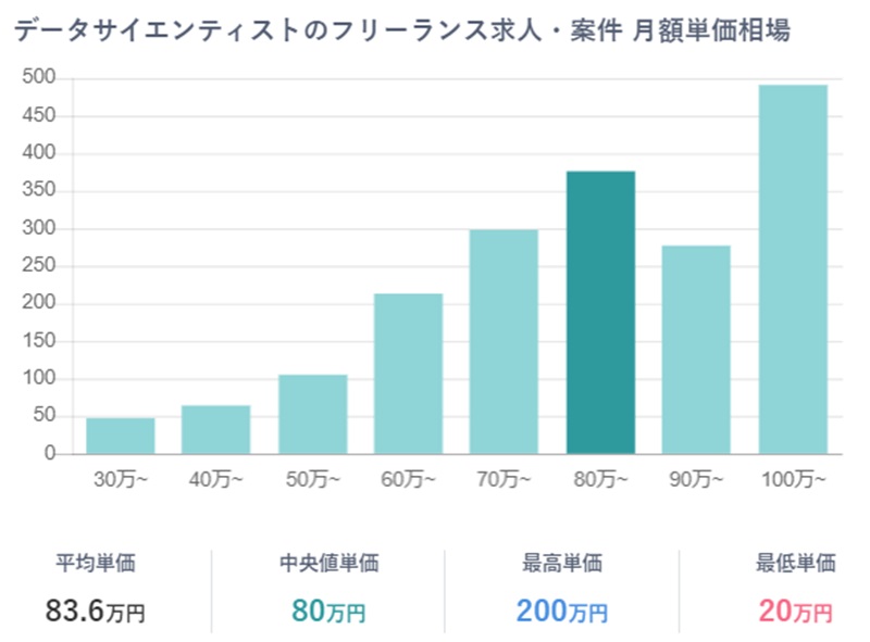 平均単価・最高単価共に非常に高額で、フリーランスデータサイエンティストが稼げる職種であるのがわかります。