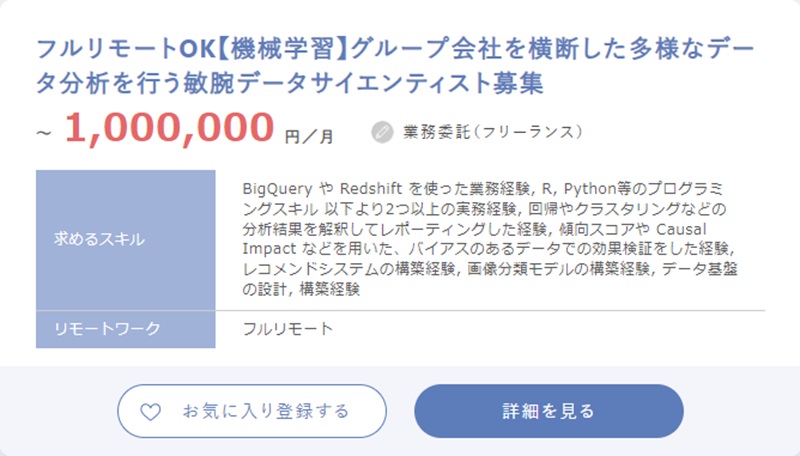 フルリモートで超高単価の上記案件は、スキルの高いデータサイエンティストが対象です。