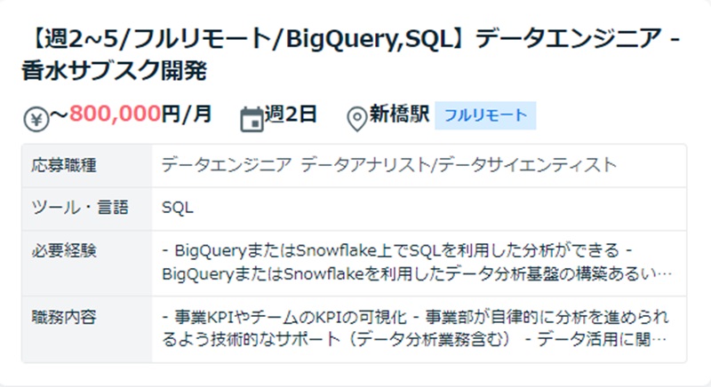 ココナラテックに掲載されている上記の案件は、サブスク開発現場でデータ領域におけるサポートをするのが仕事内容です。