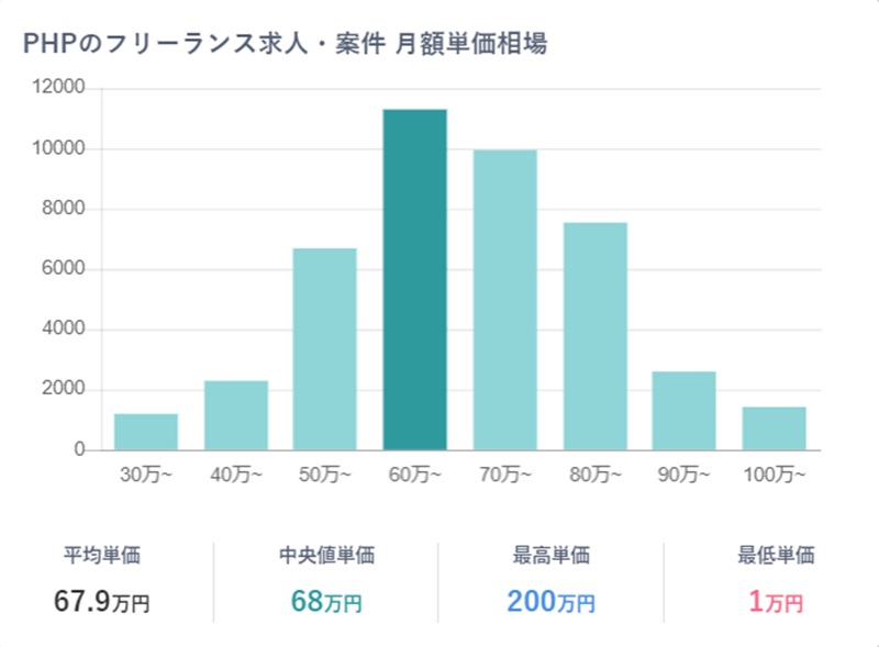 フリーランスPHPエンジニアの月額単価を見てみると、若干Laravelエンジニアの収入に劣るのがわかります。