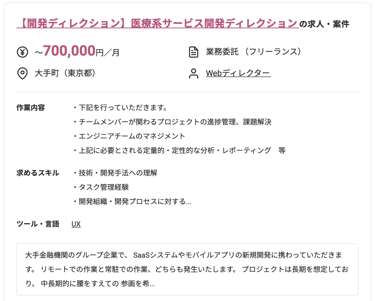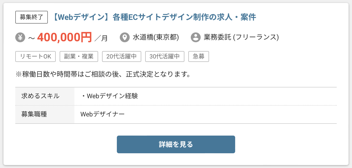 非常に高額な案件ですが、PHP開発経験が4年以上と高い水準のスキルが求められているのがわかりますね。