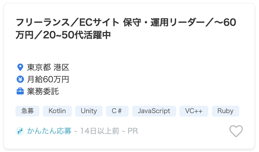 評価 職種 エンジニア・デザイナー・マーケター 案件数 1,500以上 クライアント先と直接契約で高単価の案件も多く、WEBマーケターなどの案件も充実している!面倒な確定申告の代行や退職金制度などの福利厚生サービスも好評です。※会社員をされている方の副業はNG