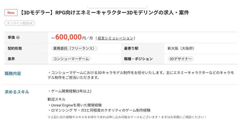 フォスターフリーランスでは、経験豊富なCGデザイナー向けの高品質な案件が多くあります。特に、ゲーム開発やアニメーション制作、映像制作などのクリエイティブなプロジェクトが多く、スキルに自信がある方におすすめです。