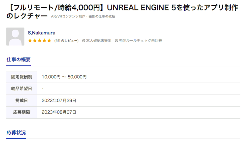 上記の案件では、Unreal Engine 5でアプリケーションを作る方法をレクチャーします。