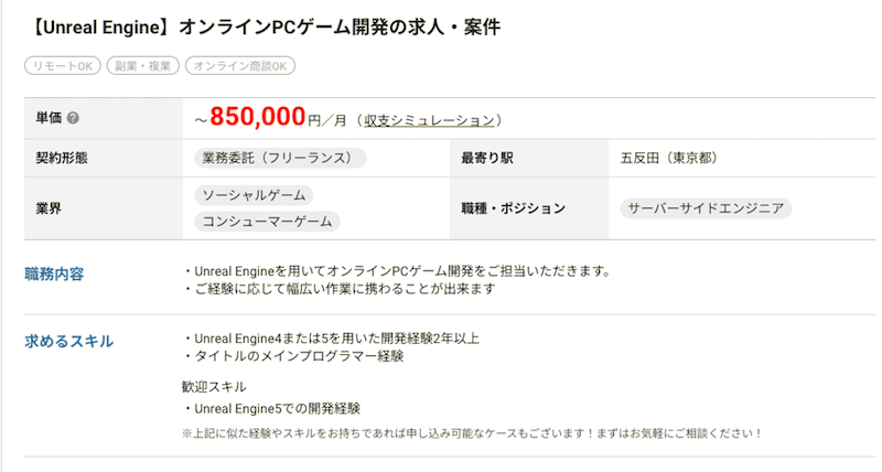 副業に適しているため、Unreal Engineの案件を選ぶ際はぜひフルリモートの案件を優先的に探してみてください。