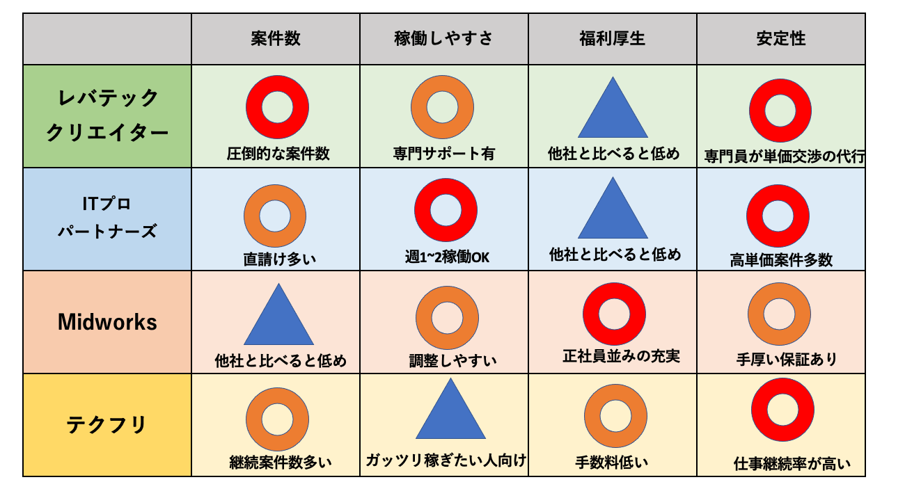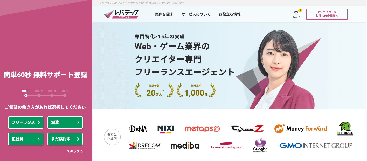 評価 職種 デザイナー・エンジニア 案件数 常時3,000件以上 保障が充実しているのも人気の理由の1つ!報酬保障や保険料の一部負担などの福利厚生。フリーランスであっても、正社員なみの保障を受けられるのが嬉しいポイント!