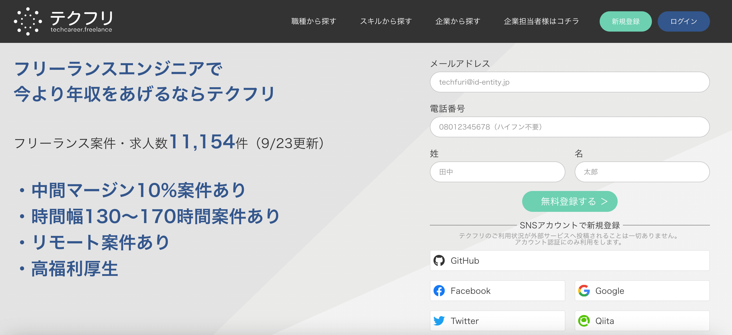評価 職種 エンジニア・デザイナー・マーケター 案件数 1,500以上 クライアント先と直接契約で高単価の案件も多く、WEBマーケターなどの案件も充実している!面倒な確定申告の代行や退職金制度などの福利厚生サービスも好評です。※会社員をされている方の副業はNG
