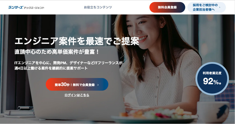 評価 職種 エンジニア・PM・デザイナー・マーケター 案件数 1.5万件以上 初級レベルからトップエンジニアまで幅広い案件を取り扱っており、『自宅でリモートワーク』や『スキルアップ』など、目的に応じた柔軟な働き方が可能です。
