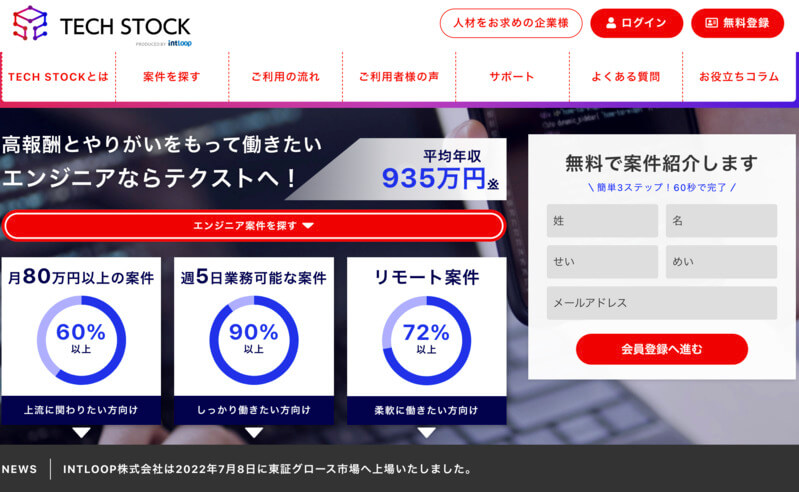 テックストックは21年の実績を持つ老舗フリーランスエージェントで、平均年収935万円という業界トップクラスの高収入を実現しています。