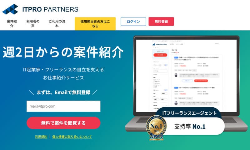 ITプロパートナーズは、週2・3日稼働やリモートワークに特化したフリーランスエージェントです。
