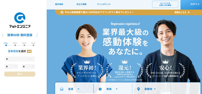 アットエンジニアは10,000件以上の案件を保有し、約5,200名のエンジニアが登録する高単価案件に特化したフリーランスエージェントだ。