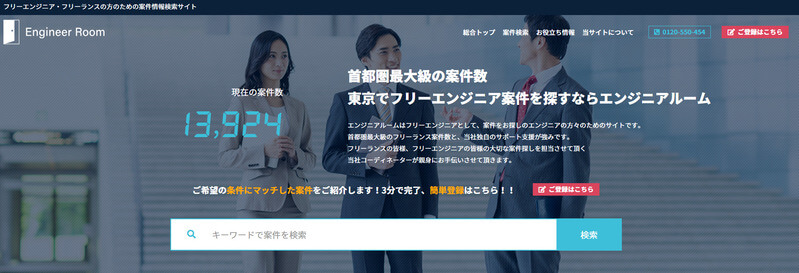 エンジニアルームは約30年間の実績を持つ老舗フリーランスエージェントで、首都圏最大級の10,000件以上の案件を保有している。